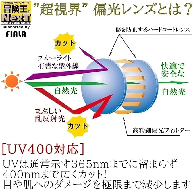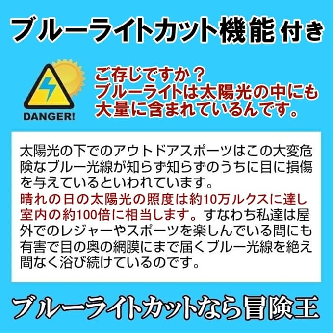 【レンズ】・偏光レンズ(光学プラスチック)・紫外線カット率:99.9% ・ブルーライトカット率:85% ・可視光線透過率:15%