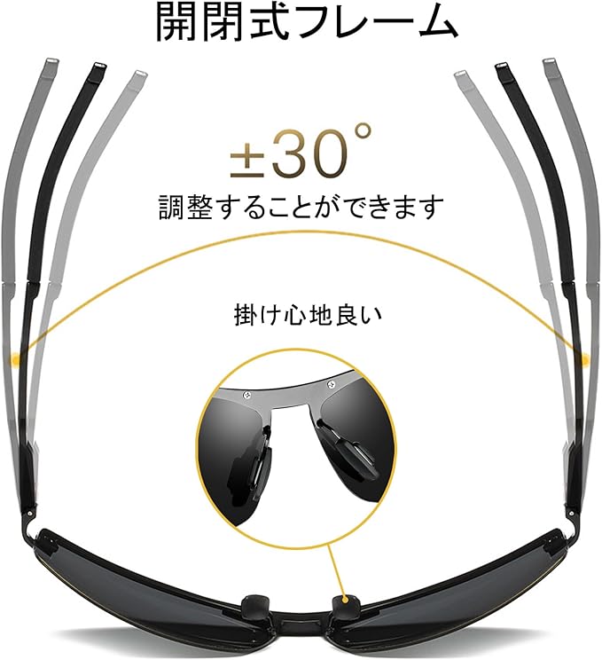 【開閉式フレーム】:柔軟な開閉機能により、顔の形に合わせて自然にフィットします。締め付けすぎず、長時間の使用でも圧迫感が少なく、耳やこめかみに負担をかけません。ドライブや旅行、アウトドアなど、長時間サングラスを着用する場面に最適です。