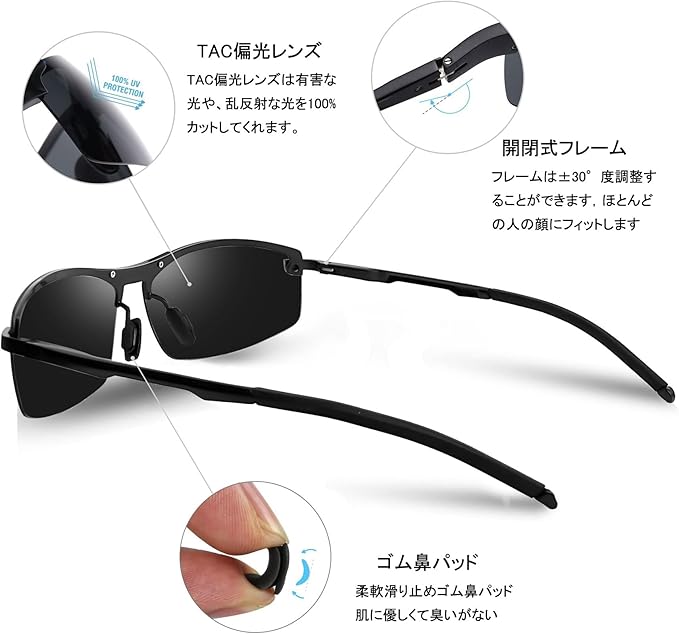 【TAC偏光レンズ】:TAC偏光レンズは、道路や水面、雪などからの反射光を効果的にカットし、快適でクリアな視界を提供し、TAC素材は、軽量で耐久性に優れており、傷や破損に強い構造を持っています。これにより、日常の使用やアウトドアの過酷な環境でも安心して使用できます。