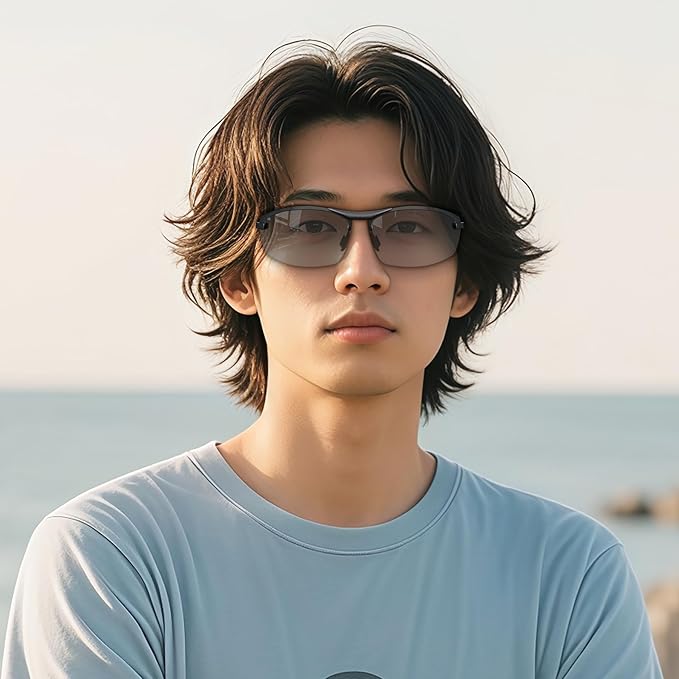 【調光レンズ】:1本で、2つの視界を楽しむ。調光レンズが、明るい場所では色が濃く、暗い場所では透明に変化し、目を常にベストな状態に保ちます。どんな光環境でも視界を守り、目の疲れを軽減。ご注意:社内、室内、曇り空など紫外線の弱いでは変色調光が弱くなることを予めご了承ください。