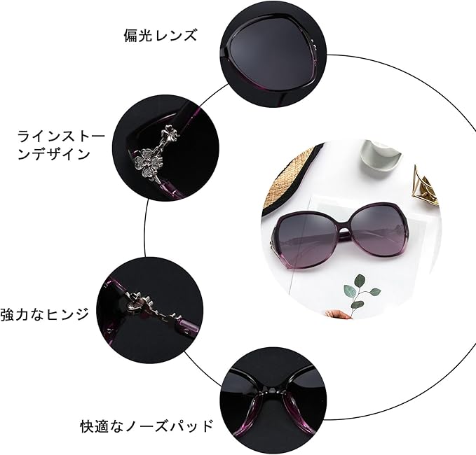 【スタイリッシュ】フレーム部分には、ラインストーンが埋め込まれており、角度によって異なる光を反射でき、掛けるだけでいつ物コーディネートをより華やかにしてくれます。日本人の顔立ちと相性良い楕円形の設計と太めのテンプルの組合で、顔の輪郭を美しく飾り付け、小顔効果も期待できるおしゃれなサングラスです。