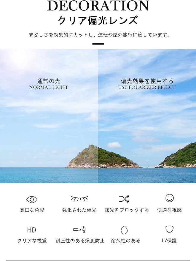 【偏光レンズ&UV 400カット】複合コーティング技術を駆使して9層レンズを重ねて作られており、紫外線を99.9%遮断でき、日差しと紫外線から目を保護でき、夏場のお出かけやアウトドアにも心置きなく楽しく過ごせます。UV400カットにより、路面、雪や海などの反射光を抑え、眩しさを軽減しつつ、色を忠実に再現できます。自然光を取り込むことにより、目への負担を軽減してくれます。