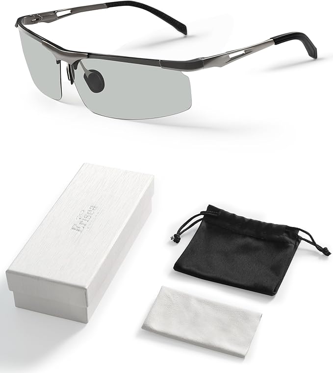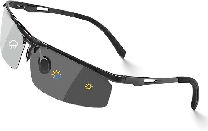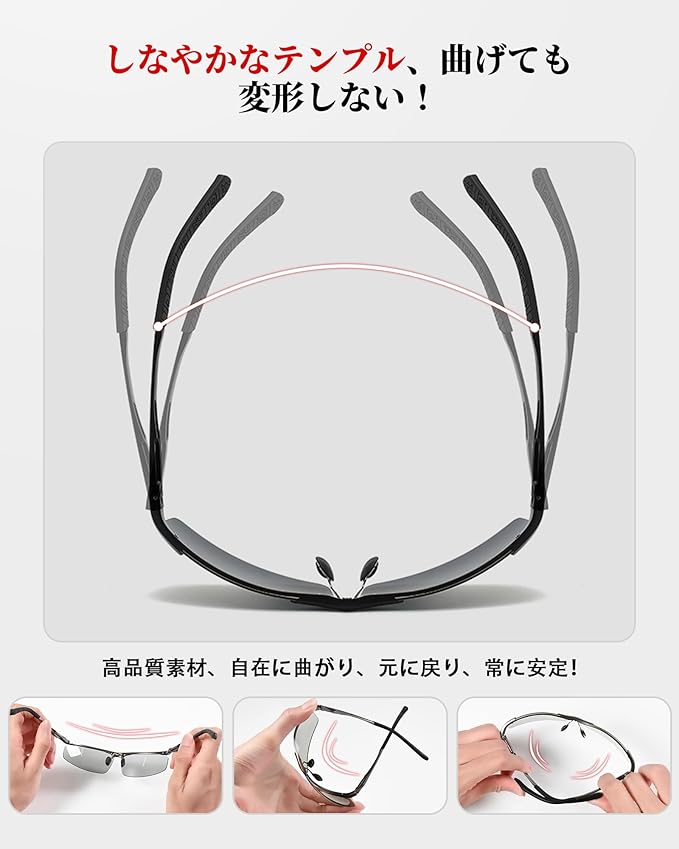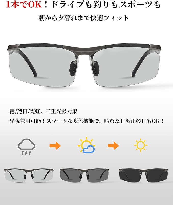 【スマートな変色機能搭載の偏光サングラス】:最先端の調光技術を採用したメンズサングラス。レンズが紫外線の強度に応じて自動的に色の濃さを調整し、晴れた日も曇りの日も、運転やスポーツ時でも快適な視界を提供します。偏光効果により反射光をカットし、クリアビジョンを実現。ゴルフや野球、ロードバイクなど各种アウトドアシーンに最適なサングラスです。*:屋外の直射日光の下では、レンズの色がはっきりと濃くなります。室内に戻ると、色が薄くなるまで少し時間がかかります。