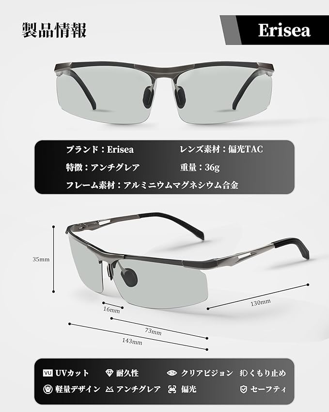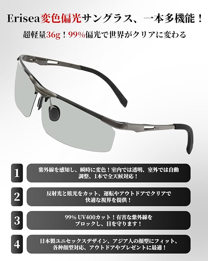 [Erisea] 偏光サングラス 調光サングラス メンズ レディース ユニセックス スポーツサングラス UV400 軽量 ゴルフ 運転用 釣り 自転車 野球 ランニング ドライブ アウトドア 調光偏光 UVカット ロードバイク サングラス