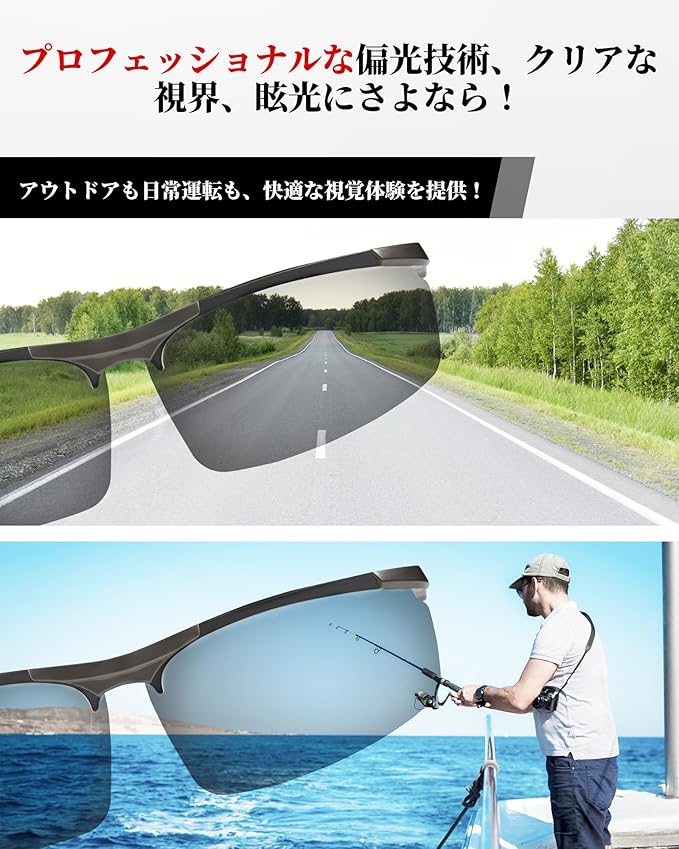 【高性能な偏光グラスで視界をクリアに】:偏光サングラス メンズとして、水面や路面からの反射光を効果的にカット。釣りやドライブ時にも大活躍。UVカット機能付きで、目を紫外線から守りながら、淖んだ視界もスッキリとします。