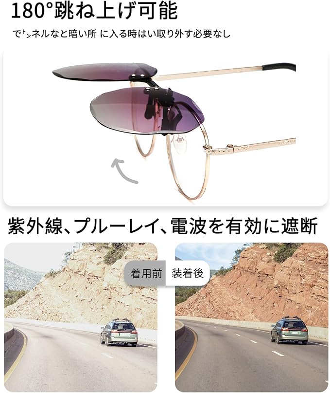 【近眼者の必携品】本体8gと軽量で、クリップは眼鏡の間で挟むことができて、すばやくあなたの近視の眼鏡の上で貼り付けて、めくって、使用して便利です。それ以来眩しさを心配する必要はありません通常のサングラスよりも簡単に切り替えられます。