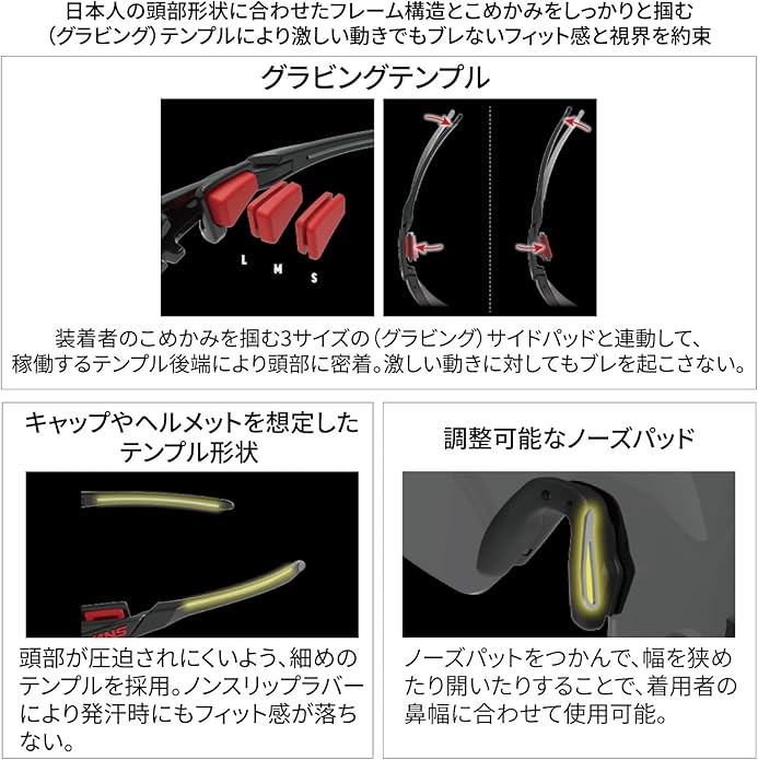 装着者の頭部を掴むようにサイドパッドがこめかみにフィットし、激しい動きをした際に起こりやすいサングラスのブレを抑えます。