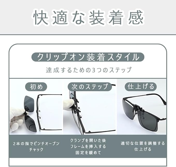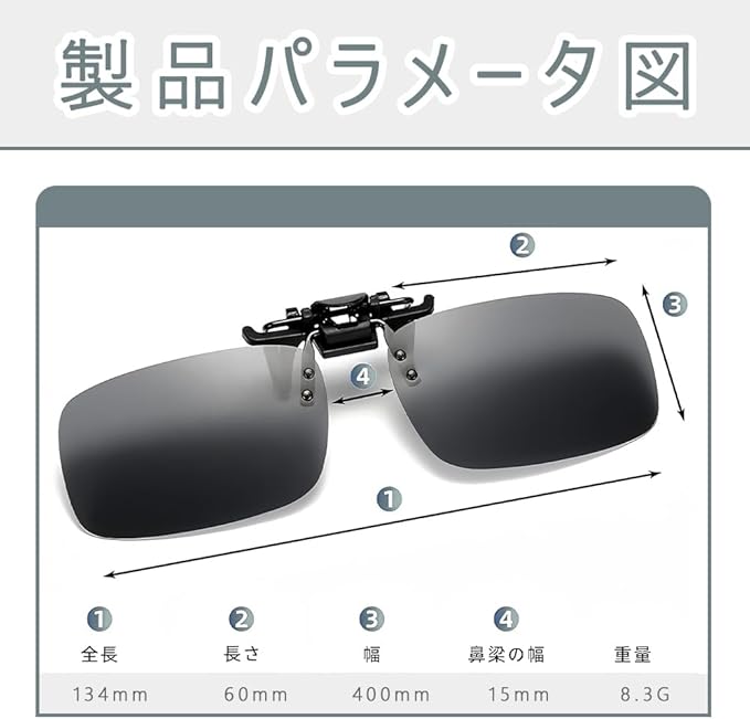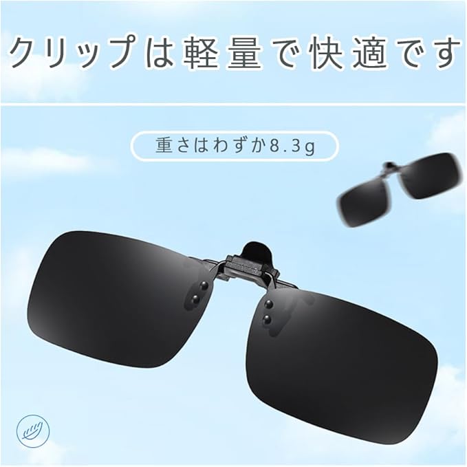 【快適な装着感】偏光レンズはより強く、より耐久性があり、より軽量です。クリックするだけで既存のメガネに取り付けられるクリップオン偏光サングラス。使用しないときはレンズを上に折り畳んでおけます。このサングラスはアジア人向けにデザインされており、超軽量なので、長時間着用しても耳が痛くなりません。
