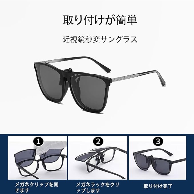 素早く取り付けられ、簡単に使用します。クリップをメガネに挟んで使用します。レンズを下ろすだけで普通のメガネからサングラスに変えることができます。