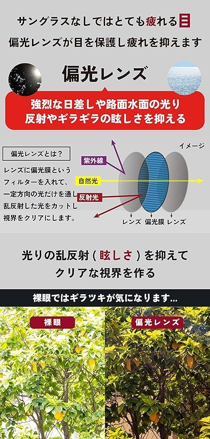 [ブルー/グリーン系偏光レンズ]太陽光をカットしつつ視界は明るく視認性を高め、効果的な遮光性に優れています。そのためやや暗い曇りの時や夕方以降の釣りや運転など、視界がやや暗い時に使うのにも向いています。ミラーになっているので目もみえにくい。
