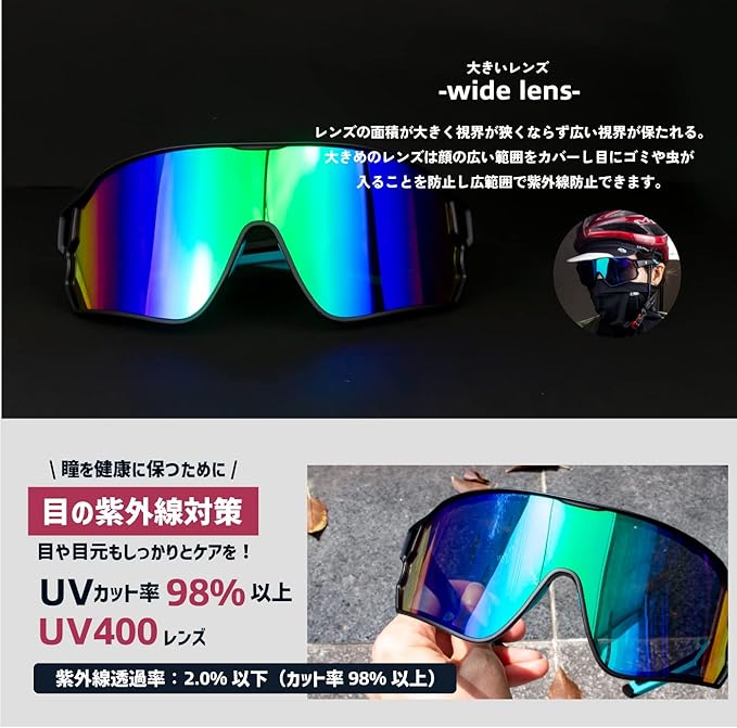 [ワイドレンズ]レンズの面積が大きく視界が狭くならず広い視界が保たれる。最近野球選手に多い大きめのレンズは顔の広い範囲をカバーし目にゴミや虫が入ることを防止し広範囲で紫外線防止できます。