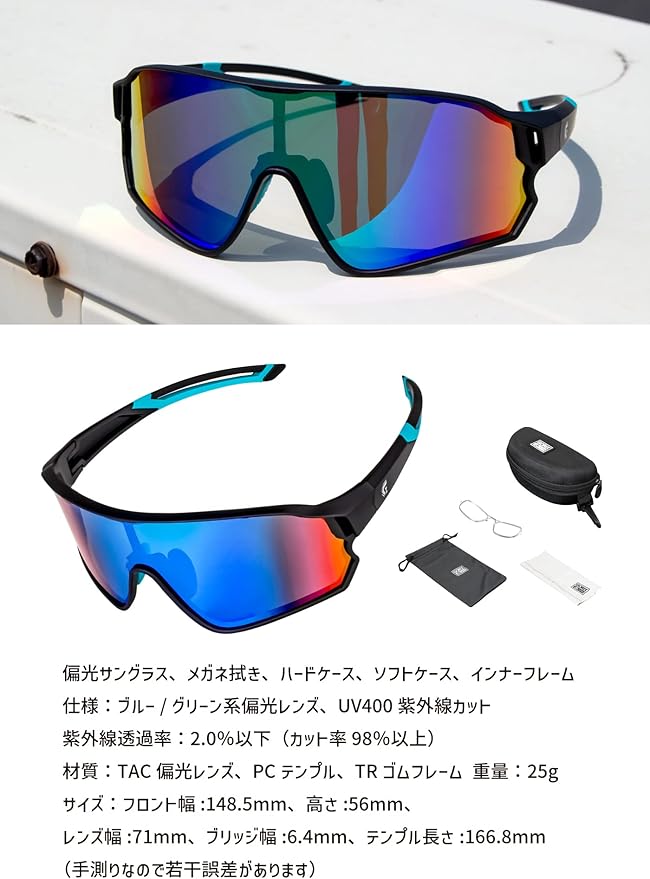 【商品内容】:偏光サングラス、メガネ拭き、ハードケース、ソフトケース、インナーフレーム【仕様】:ブルー/グリーン系偏光レンズ、UV400紫外線カット【紫外線透過率】:2.0%以下(カット率98%以上)【材質】:TAC偏光レンズ、PCテンプル、TRゴムフレーム【重量】:25g【サイズ】:フロント幅:148.5mm、 高さ:56mm、レンズ幅:71mm、 ブリッジ幅:6.4mm、テンプル長さ:166.8mm(手測りなので若干誤差があります)