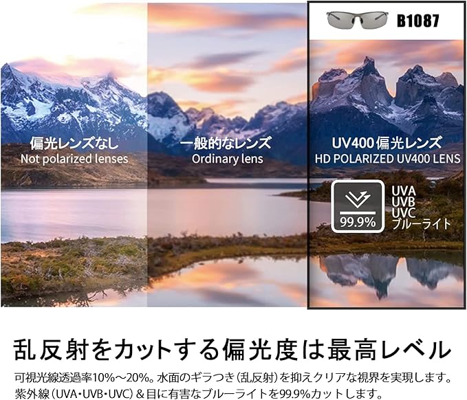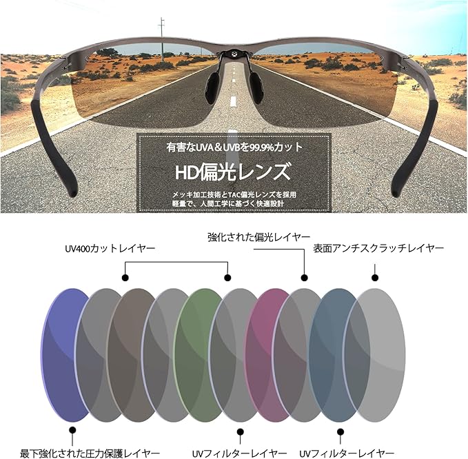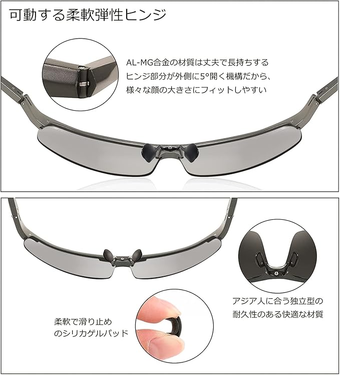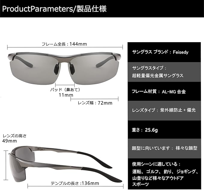 【サイズ・規格】フレーム全体横幅:約144mm フレーム全体縦幅:約49mm レンズの直径:約72mm テンプル長さ:約136mm ブリッジ幅:約11mm フレーム材質:Al-Mg合金 レンズ:UV400偏光レンズ(調光機能付きと調光機能なしレンズ)
