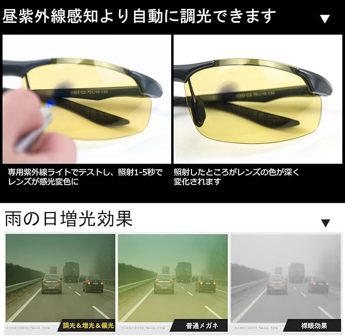 【多用途】一枚サングラスで三つ機能で、【●夜間増光●快速調光●偏光】一年中どんな気候でも利用でき、昼だけではなく、夜でも視野がクリアに、様々なところに適当で、例えば:雨の日、曇りの日、ゴルフ、野球、ランニング、自転車、山登り、旅行、野球、路面、水面、雪面からの照り返し、運転やドライブ、釣り、バイクなど活躍です。トンネルでもクリアに見え安全に運転でき●●●●●運転時注意こと:このサングラスが紫外線を監視したら、レンズの色がグレーに変わり、自動車のガラスは紫外線を遮る機能があるため、太陽天気で、運転したら、レンズが変色しません。
