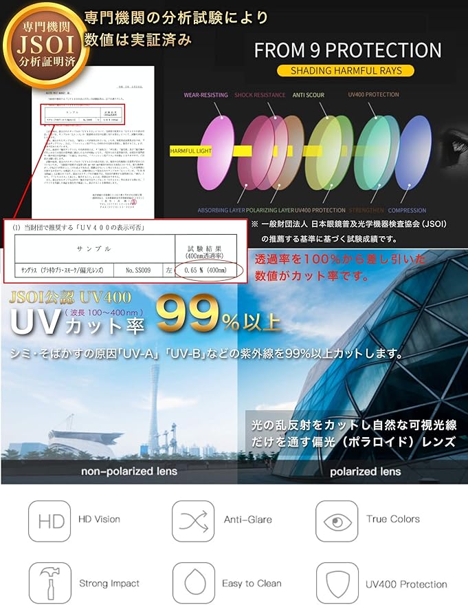 ✅【専門機関検査済み TAC 偏光 UV400 レンズ】:一般財団法人 日本眼鏡普及光学器検査協会(JSOI)の基準のに基づいたUVカット率99%以上のUV400偏光 スポーツサングラスです。有害なUVA&UVB光線を99%以上塞ぎます。TAC偏光トリアセテートレンズは偏光膜という特殊なフィルムがレンズに入っているので、眩しさや乱反射光を効果的にカットし、より快適な視界を確保することができます。