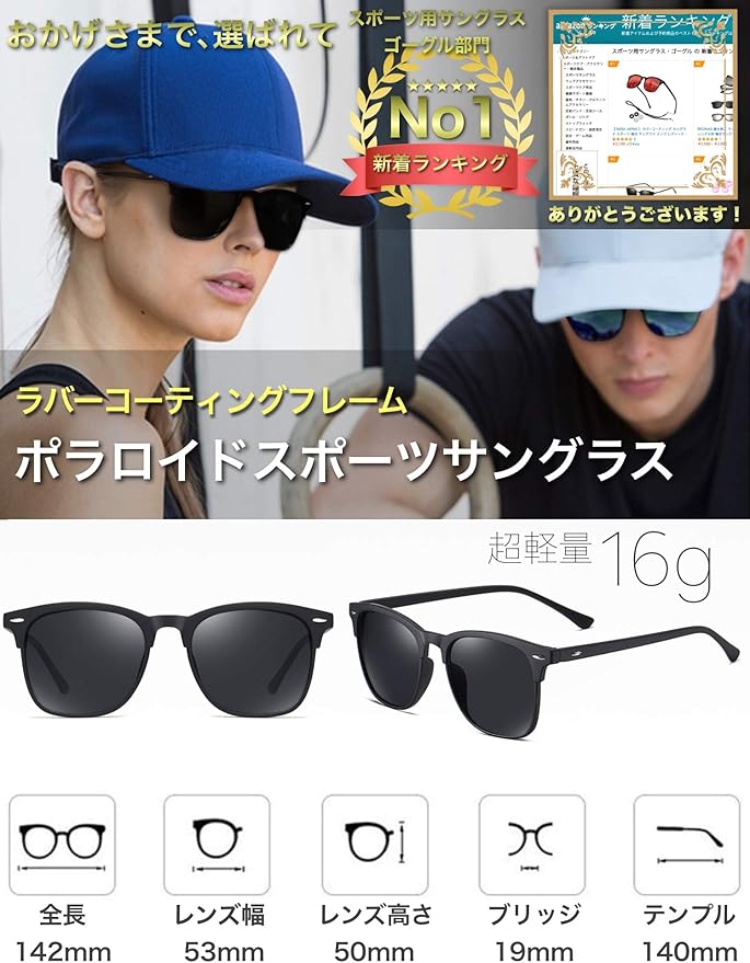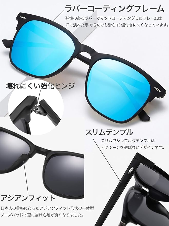 ✅【超軽量 ラバーコーティングフレーム】:16gの超軽量フレームは傷がつきにくい弾性のあるラバーコーティングが施されマットで落ち着いた仕上がりになっています。ラバーコーティングは汗などで濡れた手で握っても滑りにくくマリンスポーツ、サイクリング、ドライブ、ランニング、釣り、レース、スキー、登山とすべての屋外活動に適した偏光サングラスとしてご利用いただけます。