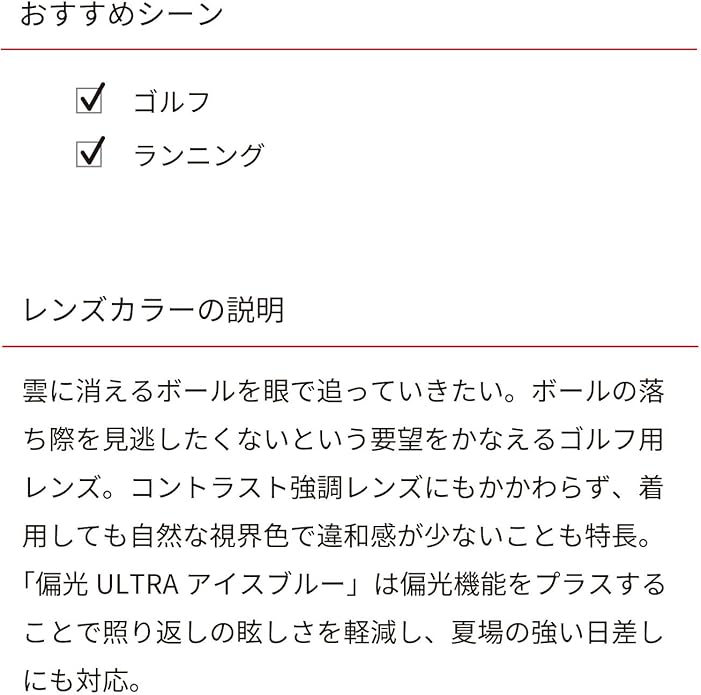 レンズ機能:ULTRA LENS for GOLF…青空へ飛んでいくゴルフボールがよく見える、偏光(偏光度:90%以上)…路面や水面などの照り返しを抑えスッキリとした視界を確保 ※液晶画面が見えにくい場合があります、UVカット率:99.99%