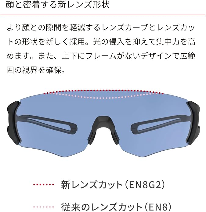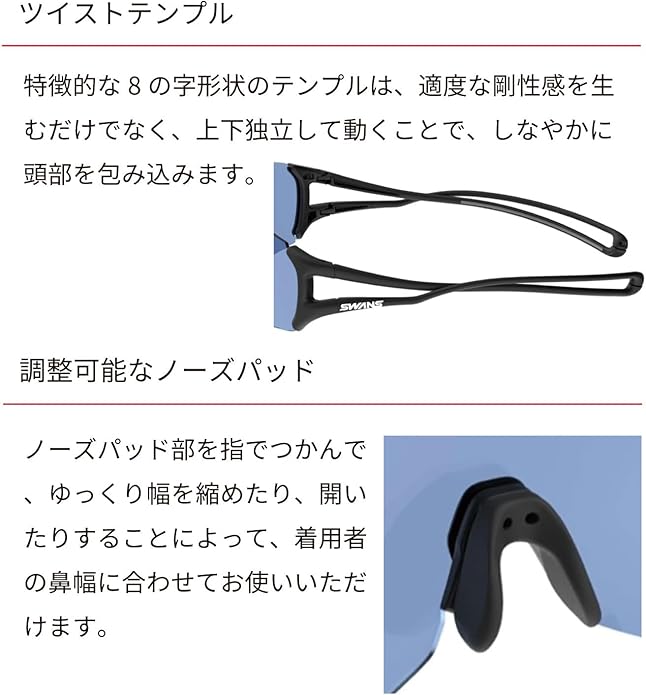 フレーム機能:指で調節可能なノーズパッド、しなやかに頭部を包み込む8の字構造のテンプルを採用し長時間の使用でも痛くなりにくい。