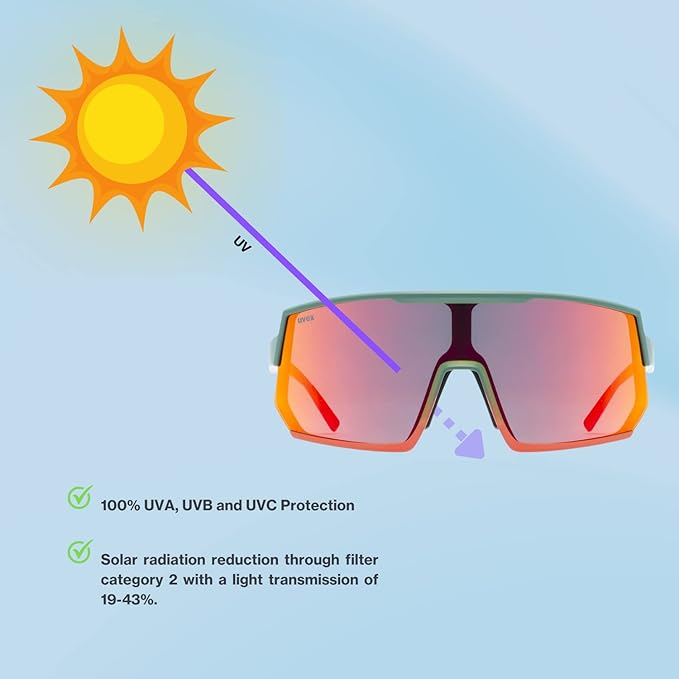 400nmまでのUV:(紫外線)ABCから目を保護します。uvexの社名の由来はuv-ex =UltraViolet EXcluded(紫外線の遮断)です。