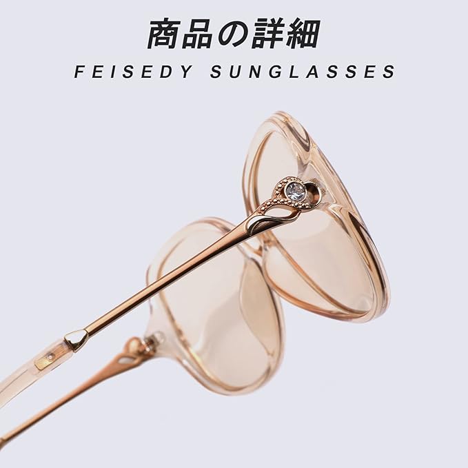 【高品質素材】FEISEDYは、リーズナブルな価格で高品質の素材のサングラスを作ることに専念しています。 FEISEDY が最も気にかけているのは、お客様のビジョンと体験です。 洗練されたデザイン、耐久性のある偏光 TAC レンズ、質感のあるPCフレーム、快適なノーズ パッド、頑丈な金属ヒンジ、滑り止めのテンプル、繊細なラインストーン飾りは、美しく実用的で、あなたの個性に完全にマッチします。