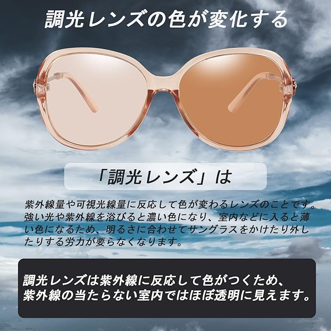 【メガネとサングラスを使い分ける必要がない】調光レンズは紫外線に反応して色がつくため、紫外線の当たらない室内ではほぼ透明に見えます。室内で色のついたサングラスをかけていると違和感がありますが、調光レンズのサングラスならかけっぱなしでもOK。シチュエーションによって使い分ける必要がないので、手間と荷物が減らせます。また、1日中外で過ごす場合や天候が変わりやすい日でも、明るさに応じてレンズの色が変化するため快適に過ごせます。【ご注意】調光レンズとは太陽光の紫外線の強弱によって変色しますので、社内、室内、曇り空など紫外線の弱いでは変色調光が弱くなることを予めご了承ください。調光効果につきましては付属の紫外線照射灯(ブルーライト)とテストカードにてご確認ください。