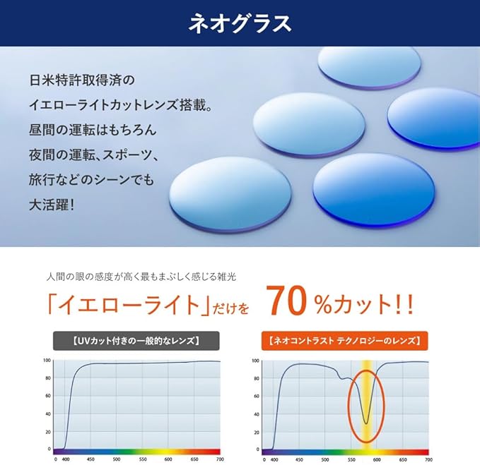 ネオコントラスト グラスは、最も眩しく感じる黄色の光(585nm)のみを集中カット! 濃いレンズカラーではないのに、まぶしさをぐっと抑え、明るくクリアな視界を確保できます。ドライブ中のトンネル内や、昼間、晴天、雨の日にもかけ替え不要で、普段使いも可能!アウトドア全般(スポーツ、つり、ハイキング、旅行、観光)などにもゼッタイにお薦めです。