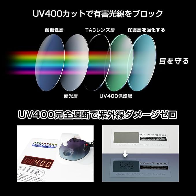 【完全UV400保護&高性能偏光レンズ】 UVA・UVB光線を100%カット。路面や水面からの不快な反射光をカットし、クリアな視界を実現。運転の安全性向上や、長時間の屋外活動による目の疲労を軽減します。