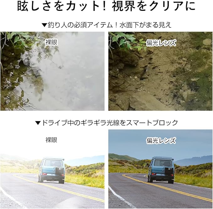 【多彩なシーンで活躍】 ドライブ、サイクリング、釣り、ゴルフなどのスポーツからハイキング、スキーまで幅広く対応。特に釣りでは水面の反射を抑え、水中の様子がより鮮明に見えます。