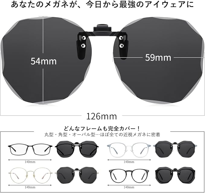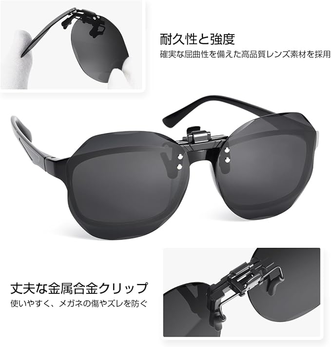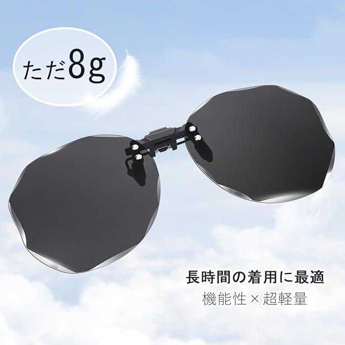 【メガネユーザー必携の便利アイテム】 わずか8gの超軽量設計で、お手持ちのメガネに簡単装着。ワンタッチで取り付け可能、跳ね上げ機能で室内外の移動もスムーズ。通常のサングラスとの付け替え不要で、快適な視界を確保します。