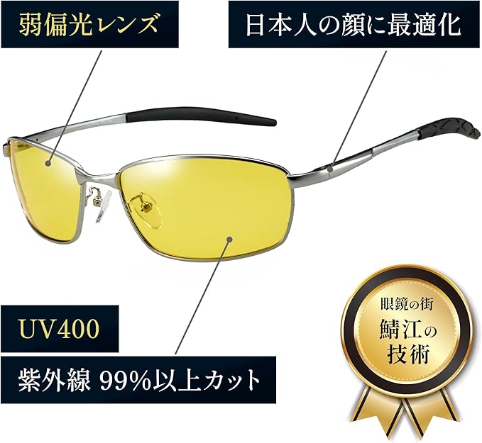 ✅【JIS夜間運転規格に適合した安心設計】 cool face偏光サングラスは、日本のJIS規格に適合する夜間専用設計。特殊なイエローレンズが**UVカット率99.9%とブルーライトカット率50%**を実現し、ヘッドライトや街灯の眩しさを軽減。夜間のドライブや雨天時の路面の乱反射を抑え、安全で快適な視界を提供します。男性にも使いやすいデザインで、メンズ、レディースのナイトドライブにも最適です。