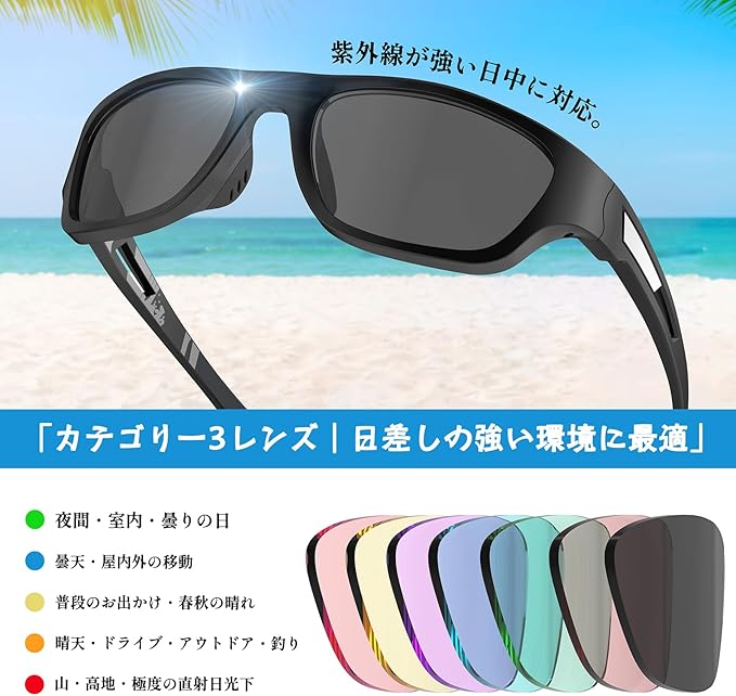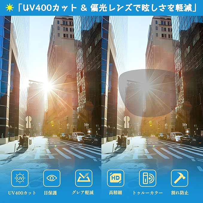 ✅【偏光レンズで反射光をカット】 高性能偏光レンズを採用し、道路や水面などからの反射光を効果的にカット。眩しさを抑え、自然でクリアな視界を提供します。釣り・運転・サイクリングなど、様々なシーンで目の疲れを軽減します。