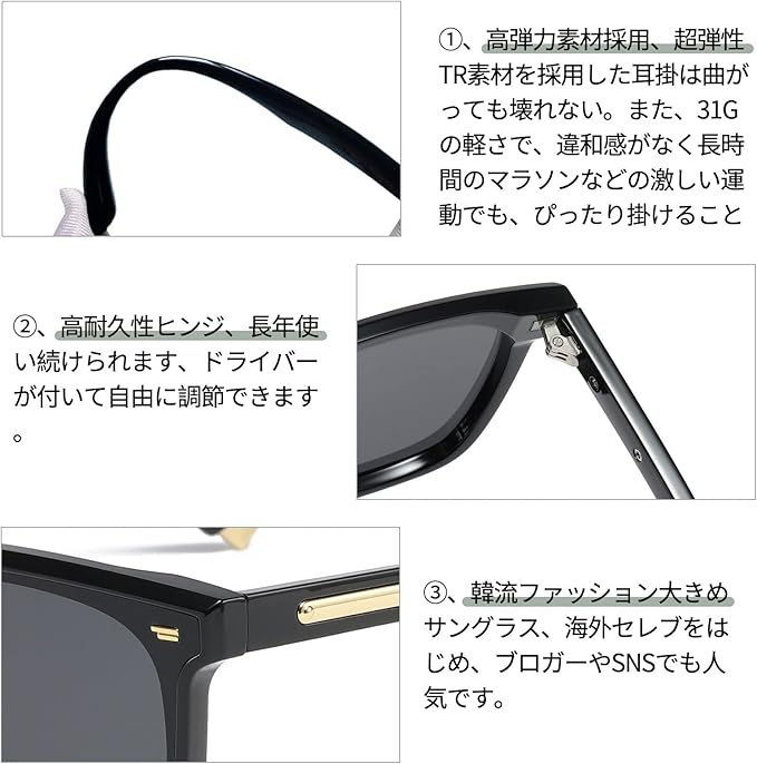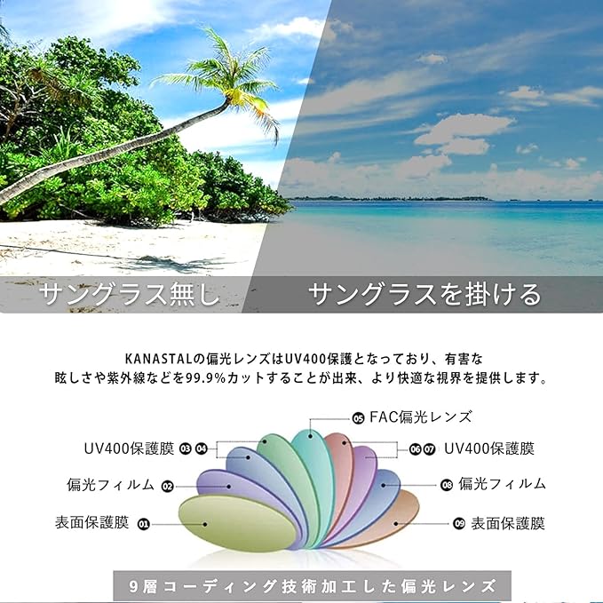 UV400 偏光レンズ:偏光レンズはUVA、UVB、UVC等の有害光を99 %カットし、可視光しか通しません。あなたの眼を紫外線や乱反射光から守ります。 雪天気、雨天、曇りの日に強烈に降り注ぐ日差し、雪面、路面、水面、からの照り返し、運転や釣り等でガラスやギラギラを効か的にカットし、クリアな視界を提供します