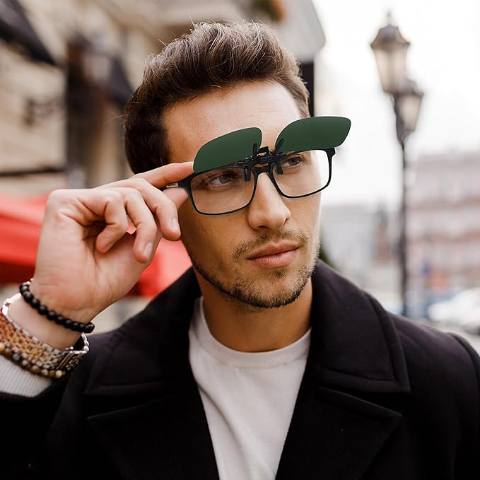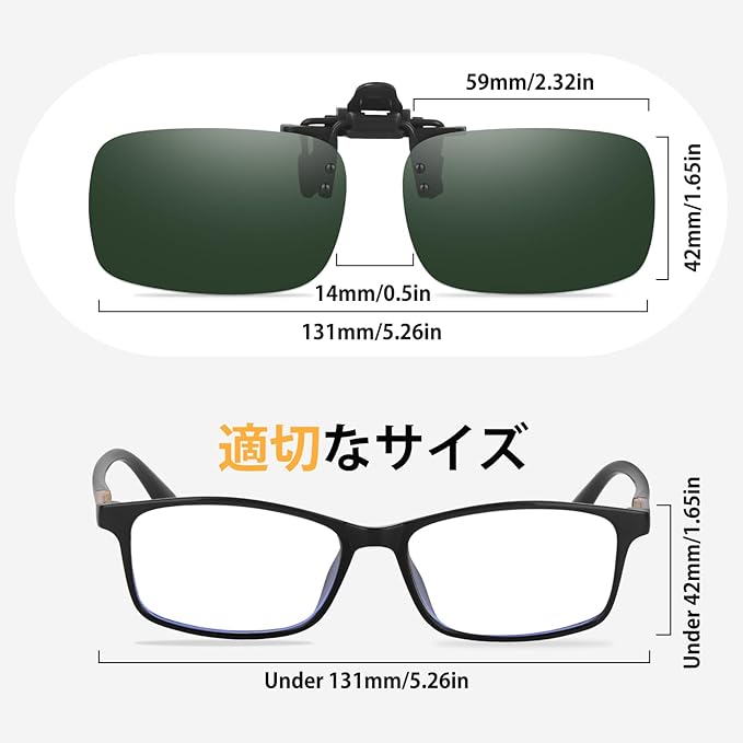 簡単に装着できて便利 - メガネに簡単に装着でき、使わない時は上にパカッと跳ね上げるだけで、車の運転中でも便利に使えます。特に日中のドライブや短いトンネルに入った時など、すぐに跳ね上げられるので非常に便利です。日常的に屋外で使うのにも最適です。曇りの日や室内では外して使用します
