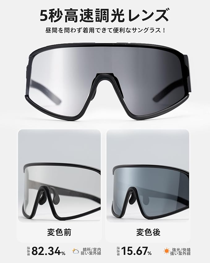 【5秒高速調光レンズ】(Cat.1-3対応)紫外線強度感知技術により、スポーツサングラスは暗所から強光下まで約5秒でレンズ色深度を自動調整(透過率10-82%)。全面蒼緑メタリックコーティング(变色款)が灰色レンズ比視界の鮮やかさと高級感を両立。昼間を問わず着用できて便利なサングラス!