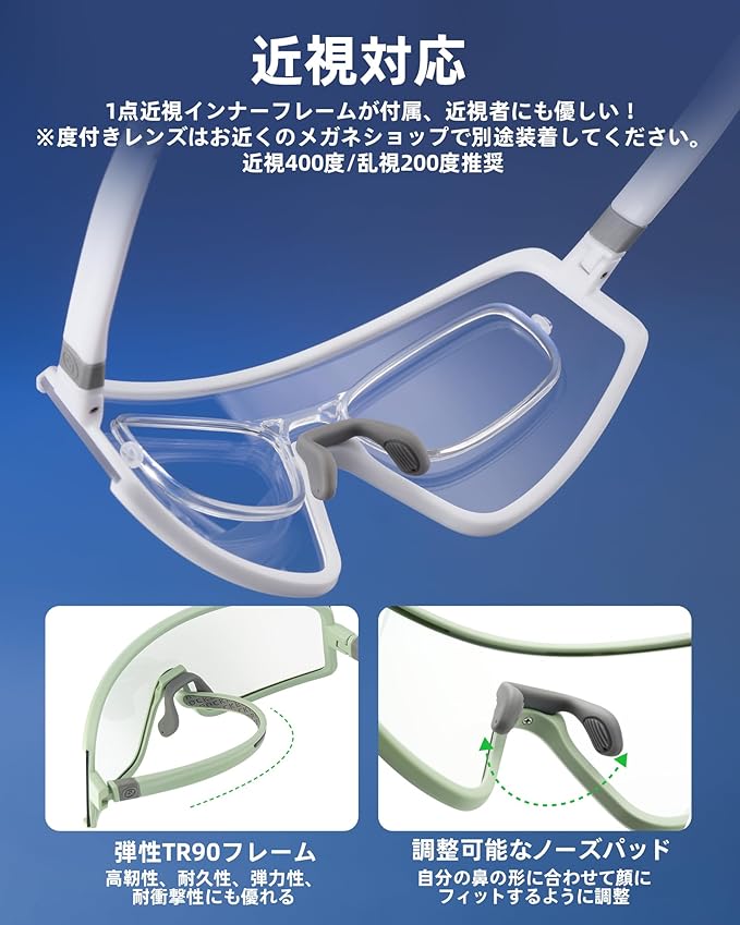 【近視対応 & 3大実用プロップ】① 開放型レンズデザイン(圧迫感軽減)② 付属近視フレーム(近視400度/乱視200度推奨)③滑り止めイヤーフック&スポーツストラップ(激しい動きでも安心)優れたポイントがいっぱいあります!また、 オーバーレンズのおかげで、防風、防塵と虫の侵入への防止の機能も向上。