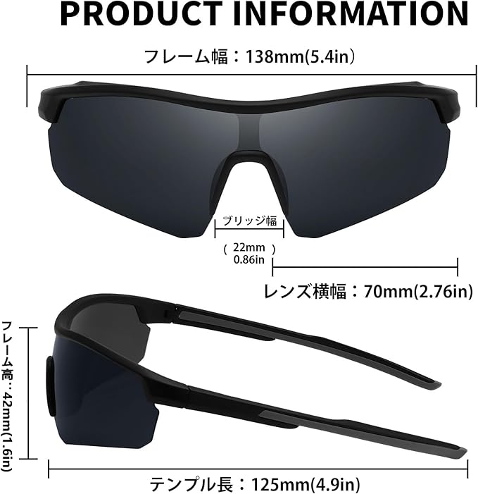 【製品サイズ】フレーム高さ:42mm(1.6インチ)、レンズ横幅:70mm(2.76インチ)、テンプル長さ:125mm(4.9インチ)、ブリッジ幅:22mm(0.86インチ)、フレーム幅:138mm(5.4インチ)
