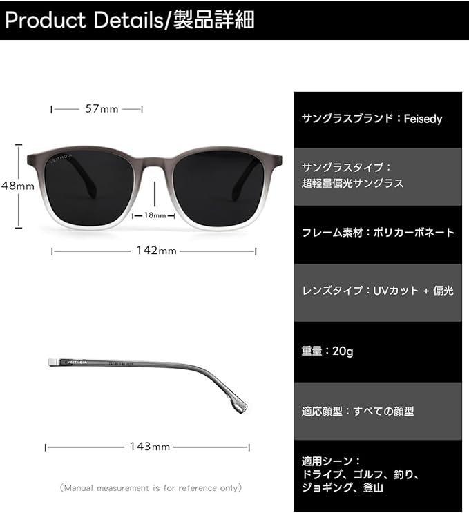 眩光対策&視界クリア---偏光レンズ採用で水面・雪面のギラつきを軽減!ドライブやアウトドア時の視認性向上。多層コート技術で不要な反射光を選択遮断!風景の色味を自然に保ちながらコントラストを向上。運転時の路面反射抑制にも効果的。
