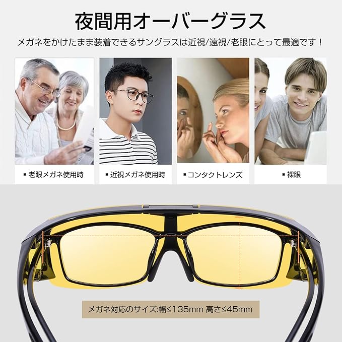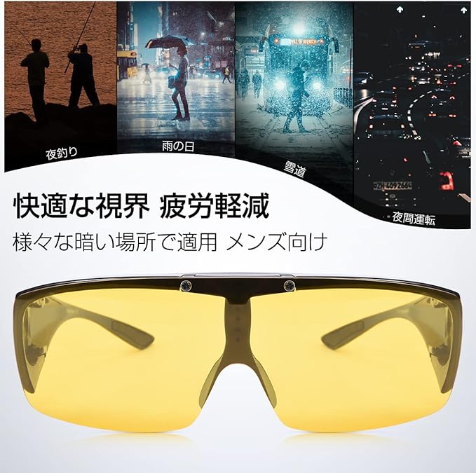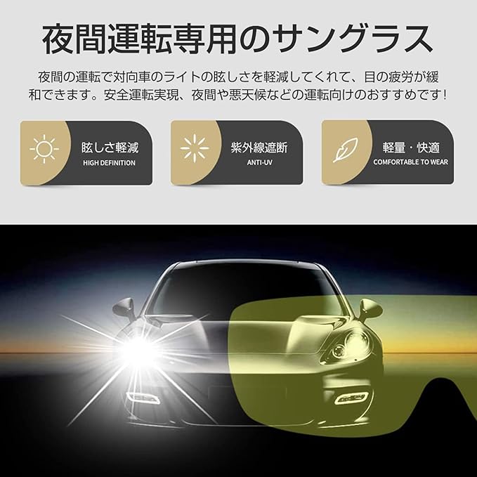 ナイトビジョンメガネは夜間に多く運転するドライバーのために設計されており、アンチグレアレンズによりヘッドライトのまぶしさを軽減し明度を増します。雨や曇りの日にも使用できます