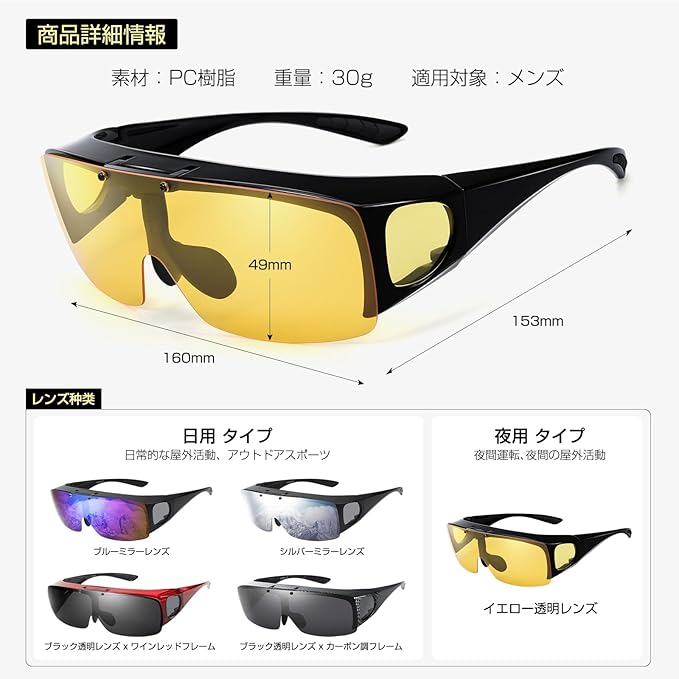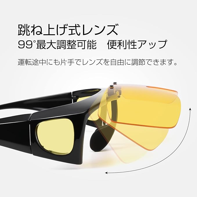 メガネの上から装着できる便利な跳ね上げ式サングラスです。偏光・UV400レンズを採用し、有害な紫外線や乱反射をカットすることで目の疲れを軽減します。特殊な凹型テンプルデザインにより、メガネとの重ね掛けでも圧迫感がなく快適な装着感を実現。ナイトドライブ対応モデルは夜間運転時の眩しさを軽減し、視界をクリアに保ちます。トンネルなどでは簡単にレンズを跳ね上げられ、調整可能な鼻あてパッドで快適なフィット感が得られます。