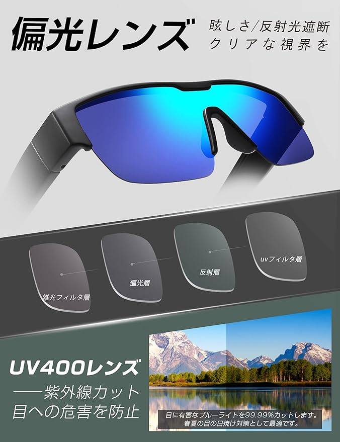 【機能な偏光サングラス】高品質の偏光レンズを採用し、路面や水面などからの反射した反射光や眩しさをカットでき、よりクリアな視界を提供します。さらに、反射光を抑えることで目への負担を軽減してくれます。