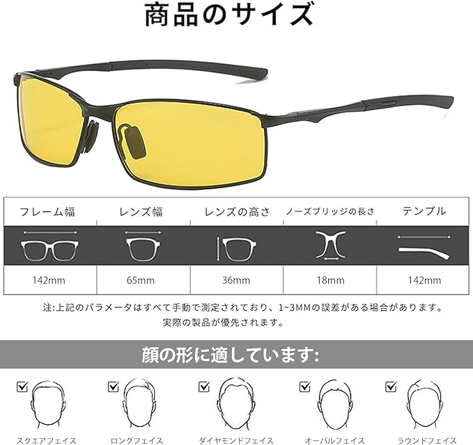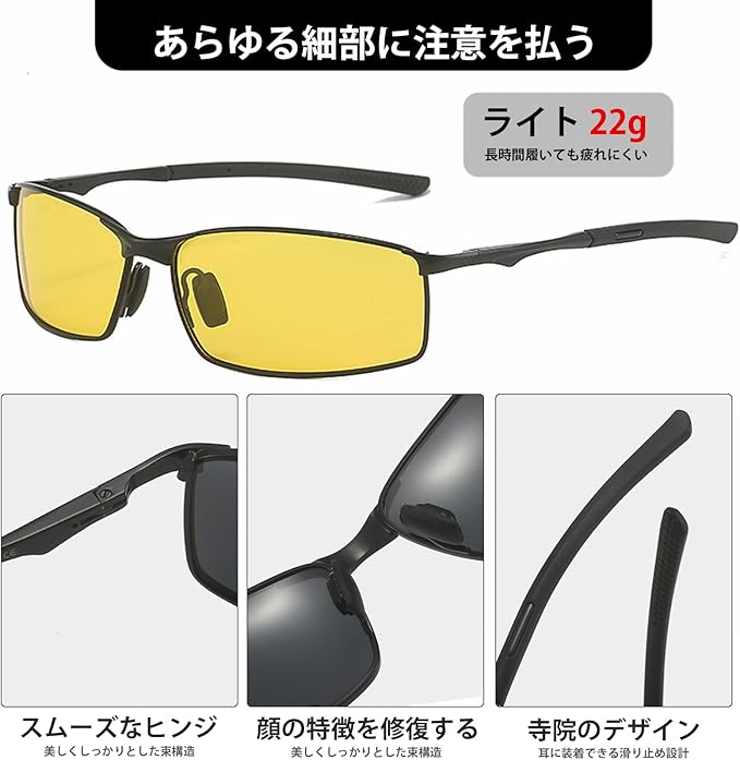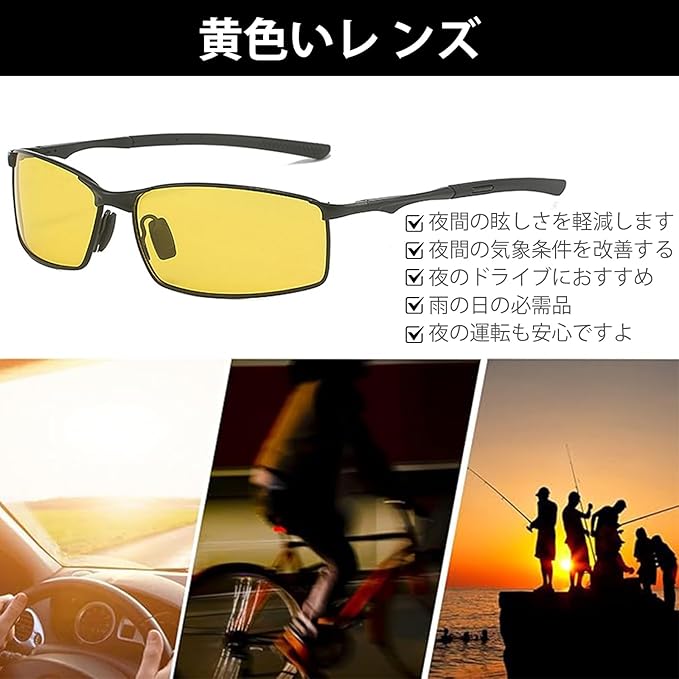 夜間サングラス 夜用運転用グラス メンズ ナイトグラス UV400 夜用スポーツサングラス 超軽量 アウトドア 昼夜兼用 イエローレンズ