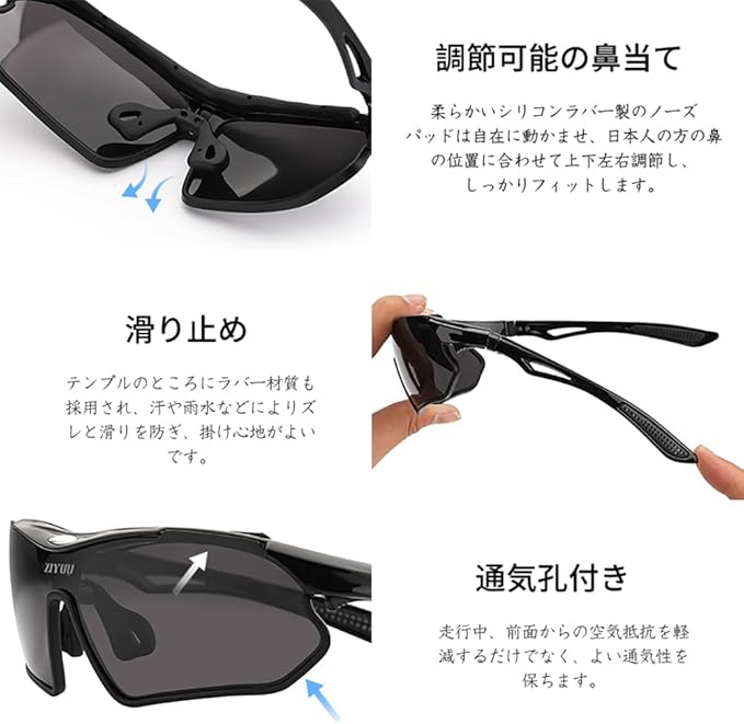 「日本人の鼻幅に合わせて微調整可能」。スポーツサングラスのシリコン製ノーズパッドが高さ調節可能!低鼻梁でもズレにくく、メガネユーザー様はその上からかけられる設計。汗でテカる顔でもグリップ力持続します。激しい運動時でもズレにくい。