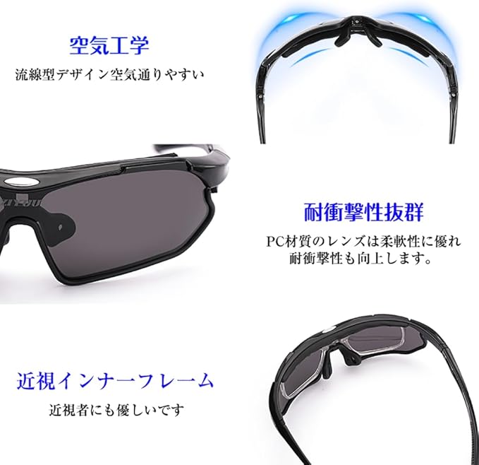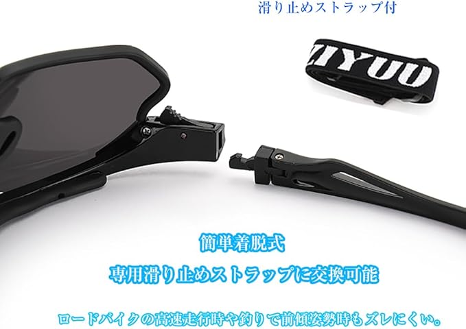 「激運動でも落下防止!」このスポーツサングラスのテンプル部分は簡単脱着式→専用滑り止めストラップに交換可能!ロードバイクの高速走行時や釣りで前傾姿勢時もズレ安心。
