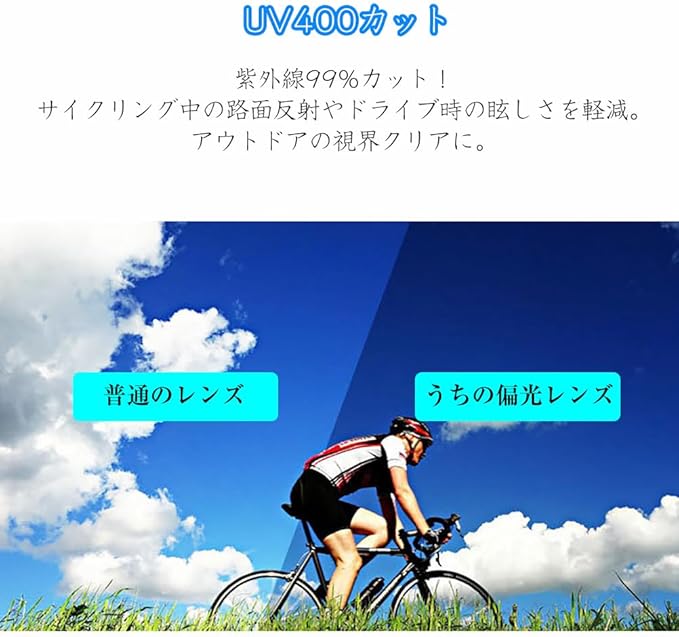 「プロ仕様の偏光レンズ!」PC(ポリカーボネート)製レンズは紫外線99%カット!このスポーツサングラスは風景の色味を損なわない自然な発色で、サイクリング中の路面反射やドライブ時の眩しさを軽減。アウトドアの視界クリアに。