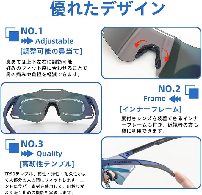 【調整可能の鼻当て・近視眼対応】ノーズパッドは上下左右に調整が可能なので、ご自身にちょうど良いフィット感にできます。快適なゴム素材で作られており、滑り止めで、長時間着用しても鼻の邪魔になりません。度付きレンズを装着できるインナーフレームも付き、近視者の方も楽に利用できます。(当ショップでは度付きレンズはご用意できません。お近くの眼鏡屋さんにご相談ください)