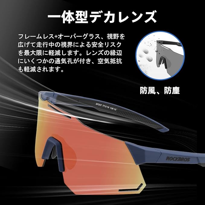 【フレームレス・オーバーグラス】軽量化を追求していたフレームレス仕様を採用しており、鼻と耳に負担をかけずにフルフレームより視界がもっと開けます。最近流行っている一体型デカレンズが登場!オーバーグラスのタイプとして、視野を広げて走行中の視界による安全リスクを最大限に軽減します。また、 オーバーレンズのおかげで、防風性、防塵性が向上し、虫から目を保護します。レンズの縁辺にいくつかの通気孔が付き、曇らなく空気抵抗も軽減されます。
