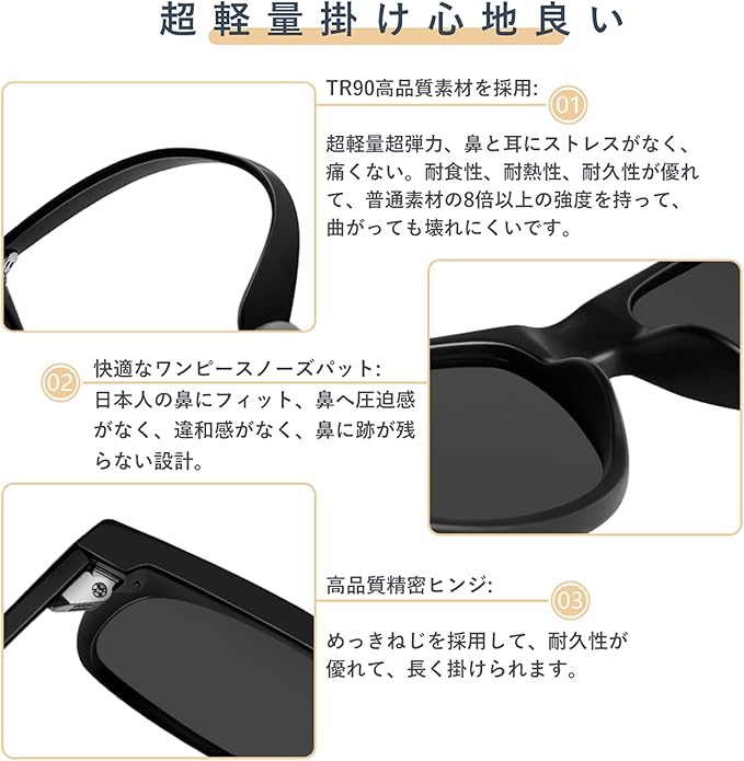 3.【TAC偏光レンズ】表面に特殊な9層も重ねてコーティング技術加工しています、有害な光や、乱反射な光を100%カットして,強い日差しから目を守ってくれます。視界を鮮明に保ちますTAC偏光トリアセテートレンズは、耐衝撃性、軽量性、耐久性が優れて、長く使えまられ。