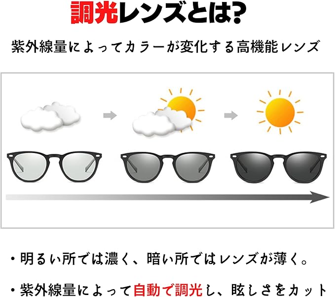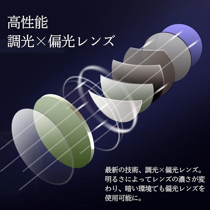 【調光・偏光レンズ】高性能レンズを採用。紫外線量によってレンズの色が変化。偏光フィルムを内蔵することで、視界のギラつきを防ぎます。※紫外線量、気温によって調光量は変化いたします。