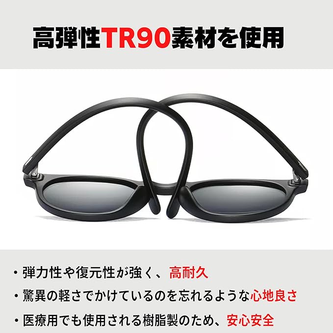 【TR90素材を使用】高弾性、高耐久、軽量のTR90フレームを採用。医療用でも使用されている樹脂のため、安心してお使いいただけます。