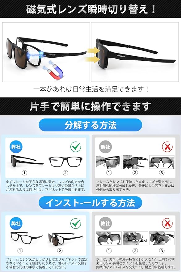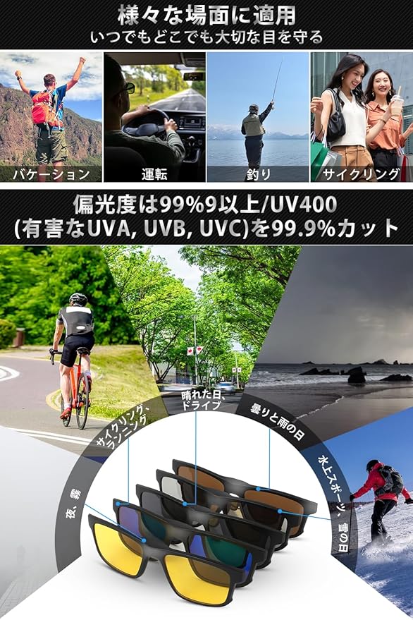 【5つの交換可能レンズ、磁気式レンズ瞬時切り替え】サングラス 偏光、一本があれば日常生活を満足できます。また、コンパクトで持ち運び便利で、磁気式レンズ瞬時切り替え。スポーツサングラス 調光 軽量なデザインは、オートバイ、サイクリング、ドライブ、ランニング、野球、ゴルフ、釣り、レース、スキー、登山、トレッキング、その他のアウトドア活動に最適です。且つ、雨、曇り、路面、水面、雪面の天気に、自由にレンズを交換して、ご使いいただけます。